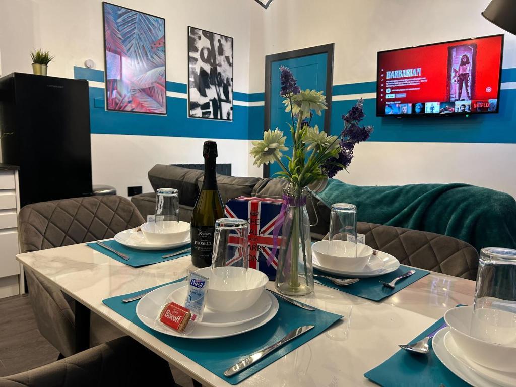 Tudors Two Bedroom Apartment is located close to city centre, set up with hotel-like amenities such as fresh linen, towels, toiletries, a fully equipped kitchen with a toaster, fridge/freezer, kettle and cooking items. We also provide NETFLIX, a Smart TV and high-speed Wi-Fi. All bills are included.